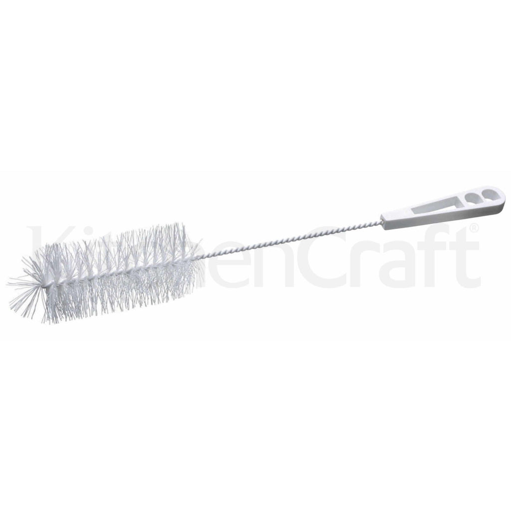 Traditional large-sized deluxe bottle cleaning brush with an angled soft nylon bristle head and a plastic handle with integral hanging loop.